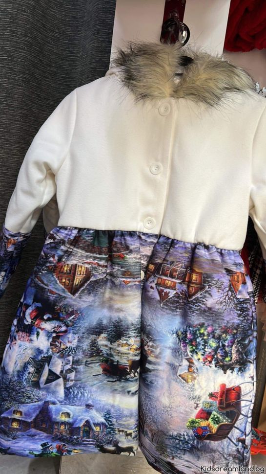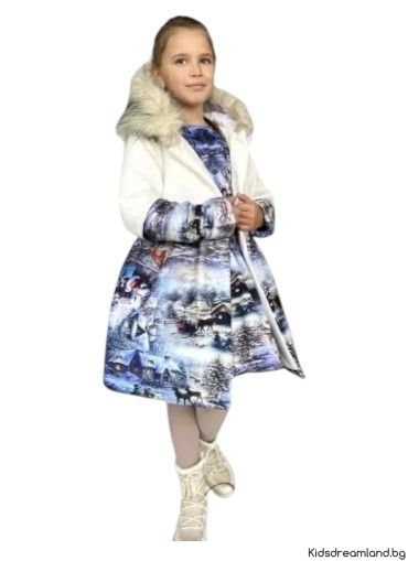 - Прекрасно зимно детско палто с картинка на зима с качулка.