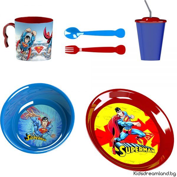 - Комплектът включва: чаша, капак, сламка, малка купа, голяма чиния, лъжица, вилица, чаша с дръжка
