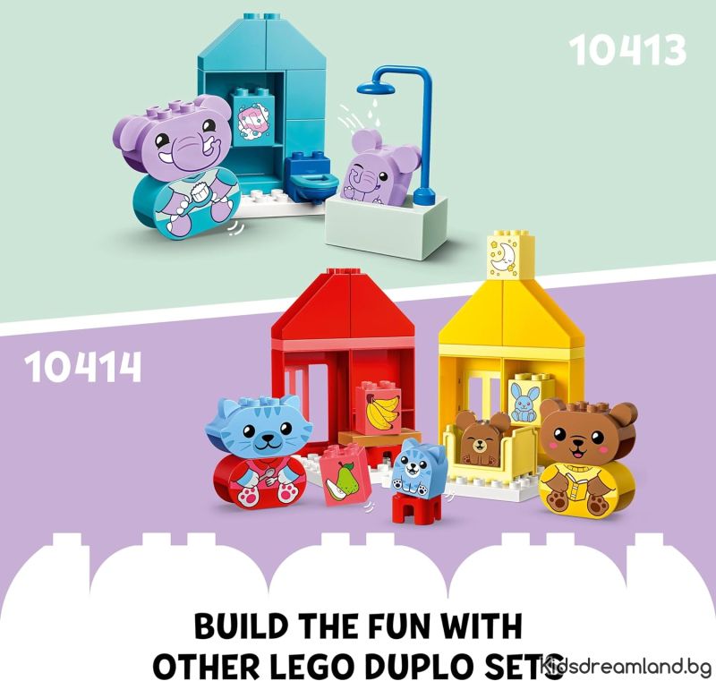 Помогнете на малките деца да изследват чувствата си с играчката LEGO® DUPLO® Моите първи ежедневни навици: ядене и сън (10414). Забавната, практична играчка за деца на възраст над 18 месеца се предлага с 4 животни, които са свързани. Времето за лягане и хранене може да бъде емоционално за малките, но тази играчка за ранно обучение позволява на малките деца да изразят как се чувстват по време на тези дейности. Комплектът се предлага с 2 семейства сладки животни, като и двете включват възрастно животно и дете. Фигурите на коте и мече се предоставят с тухлички за лице с 2 изражения – едната страна е щастлива, а другата тъжна – което улеснява малките деца, които все още не могат да говорят, да покажат как се чувстват. Комплектите LEGO DUPLO са чудесен начин за учене чрез игра. По време на забавните, интерактивни ролеви игри, родителите могат да използват фигурите, за да обяснят на малките деца важността на ежедневни навици. Малките деца развиват фини двигателни умения, докато сглобяват цветните тухлички, за да конструират 2 къщи. Всяка ежедневна дейност е кодирана с цвят, за да се улесни построяването.