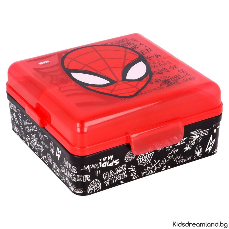 Квадратна кутия с декорация на Spiderman, което бързо ще я превърне в любим аксесоар.