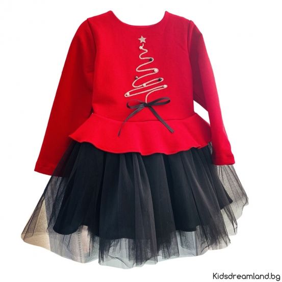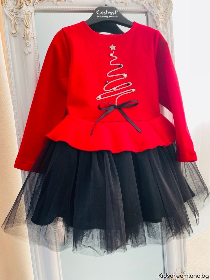 Подарете стил и празнично настроение с тази впечатляваща коледна рокля от Contrast! Горната част е от мека, топла материя в червено с дълъг ръкав и бродиран стилизиран мотив на коледна елха, декориран с перлички и звездичка. Черната сатенена панделка акцентира на талията, а обемната тюлена пола в черно придава елегантен завършек с контрастна визия. Перфектен избор за коледни партита, фотосесии и празнични събития.