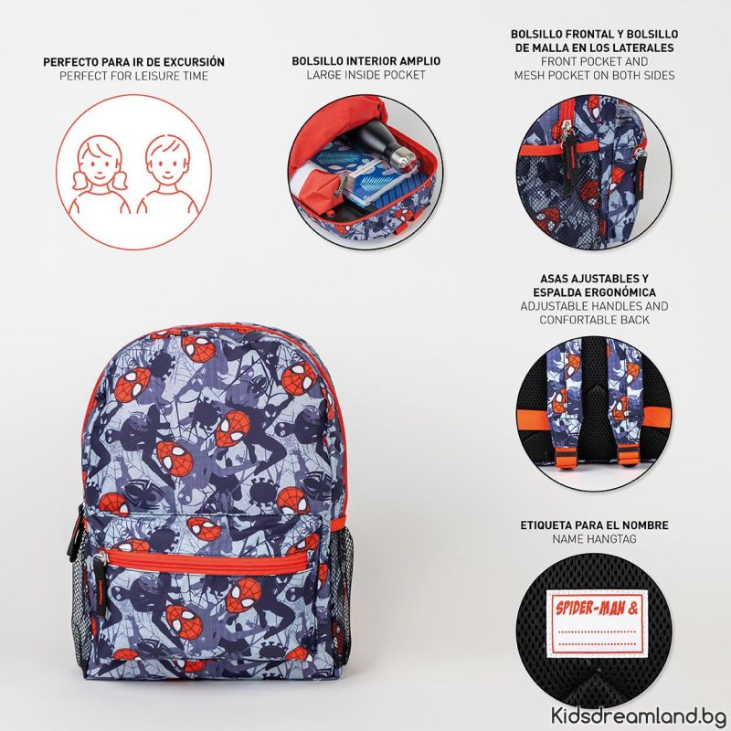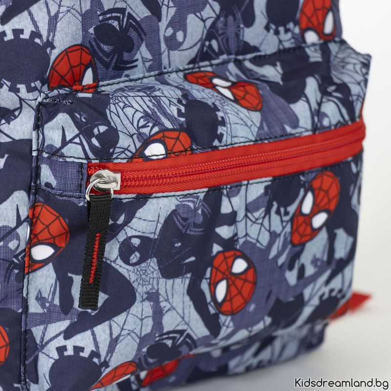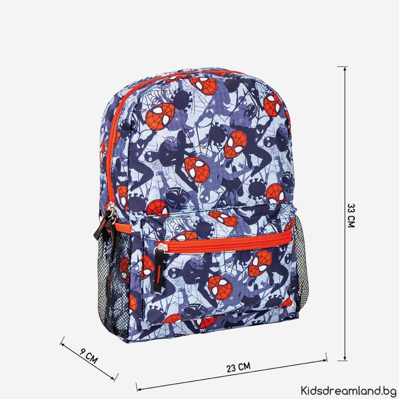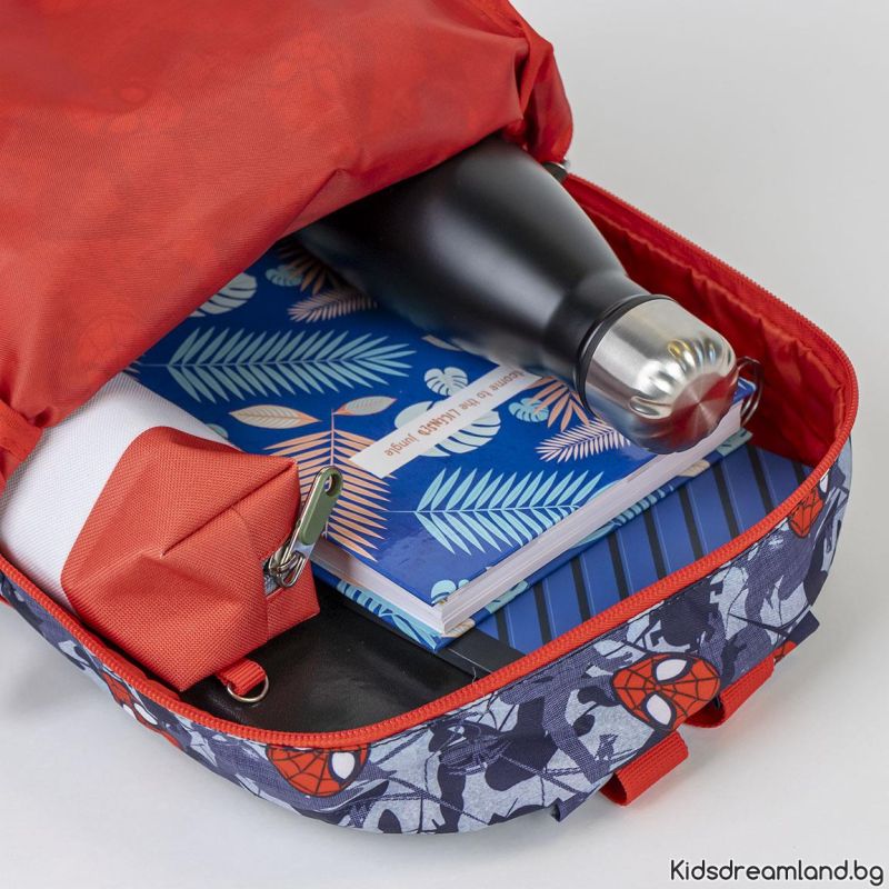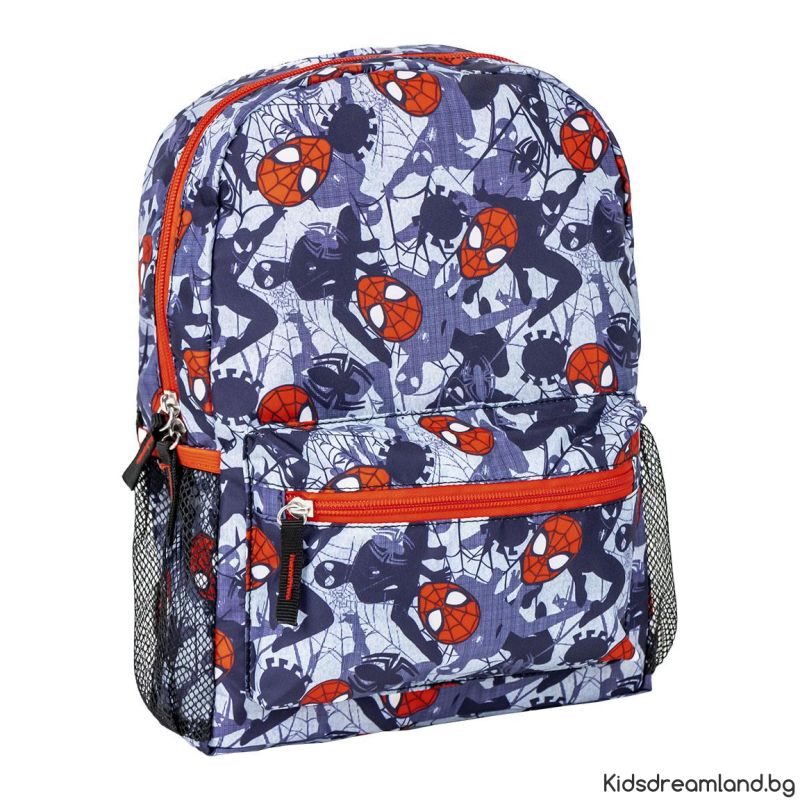 Раницата за детска градина е щампована с дизайн на Spiderman. Снабдена е с основно отделение с цип, преден джоб с цип и два странични джоба за бутилка. Подплатените регулируеми презрамки и гръб създават допълнителен комфорт на ученика при продължително носене.