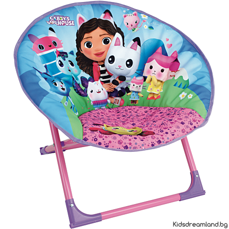 Това Кресло ще зарадва вашето дете да седи удобно като възрастен! То ще се радва да открие любимият си герой, Gabby's Dollhouse. Материали: 100% полиестерна метална рамка.