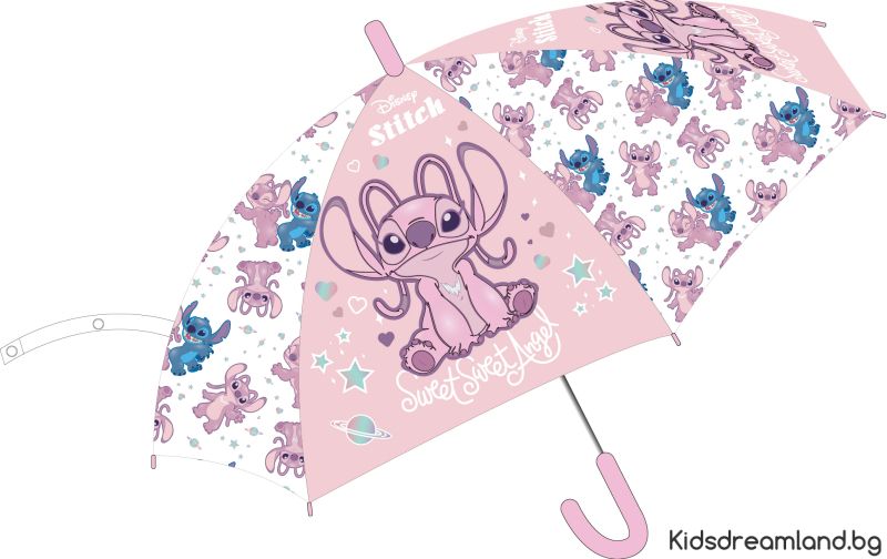 Детски чадър STITCH, Rainy Days със сладко животинче и надпис Aloha, ще освежи дори мрачния и дъждовен ден на вашето мъниче. Размерът на чадъра е адаптиран за деца и е практичен за използване, тъй като позволява лесно отваряне и затваряне.
