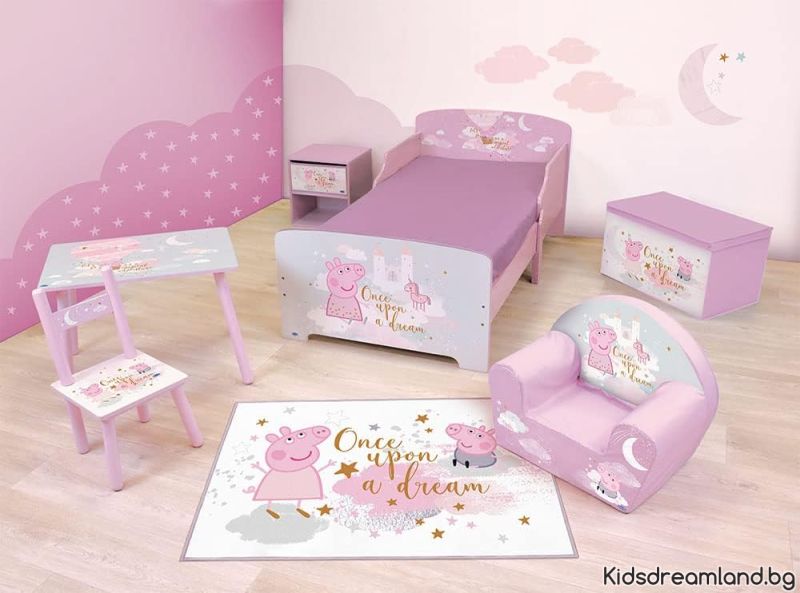 Това нощно шкафче е основният декоративен елемент, който внася нотка фантазия в спалнята на вашата малка героиня с най-известното прасенце PEPPA PIG!!Той може да постави лампата си върху него и също да скрие или съхранява тези малки съкровища в чекмеджето!Материал: MDF + тъкано чекмедже - Предназначено за деца от 24 месеца - Лесно за почистване и сглобяване