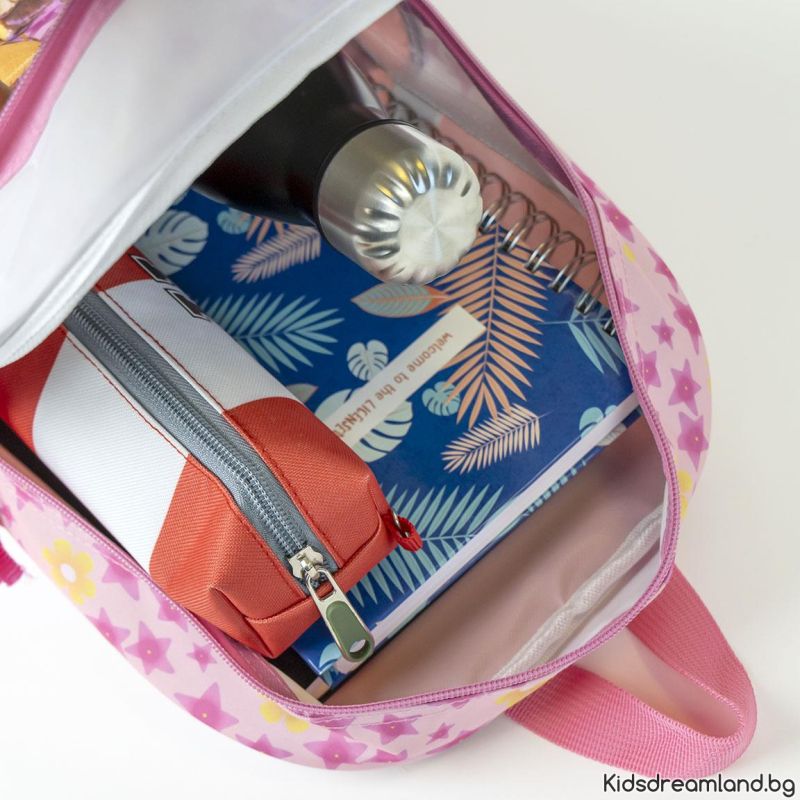 Раницата е щампована с дизайн на любим герой . Снабдена е с основно отделение с цип и регулируеми презрамки