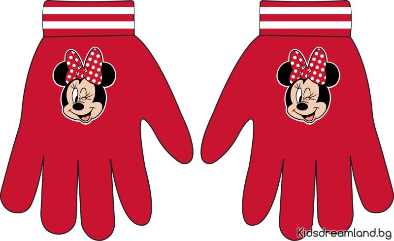 Червени детски ръкавици с персонаж на Мини Маус. Ръкавиците се отличават с весела графика на Мини, която намига и носи характерния си червен лък с бели точки. Маншетите на ръкавиците са декорирани с бели и червени ленти, което придава весел и динамичен вид на цялото нещо. Перфектен за студените дни за малките фенове на класическите герои на Дисни.