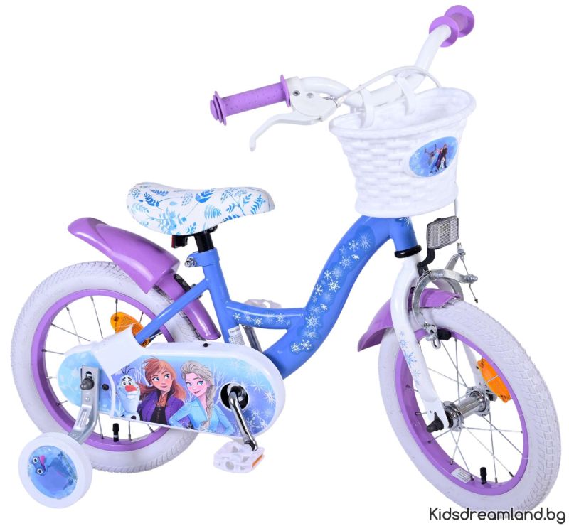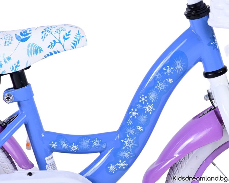 Безопасността е на първо място! Ето защо този страхотен велосипед има ръчна спирачка и спирачка за увеселителен парк и подвижни тренировъчни колела. Помислено е и за комфорта. Красивият син велосипед Frozen е оборудван с кош. За да се наслаждавате на велосипеда възможно най-дълго, седлото и кормилото са регулируеми по височина.