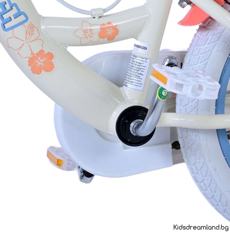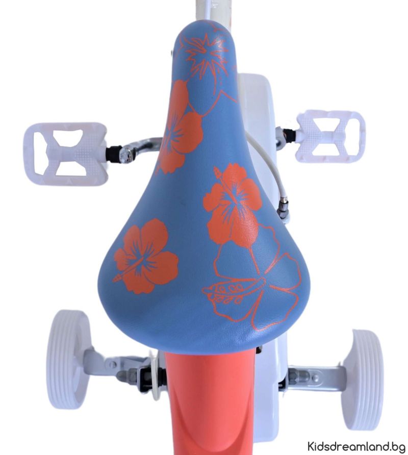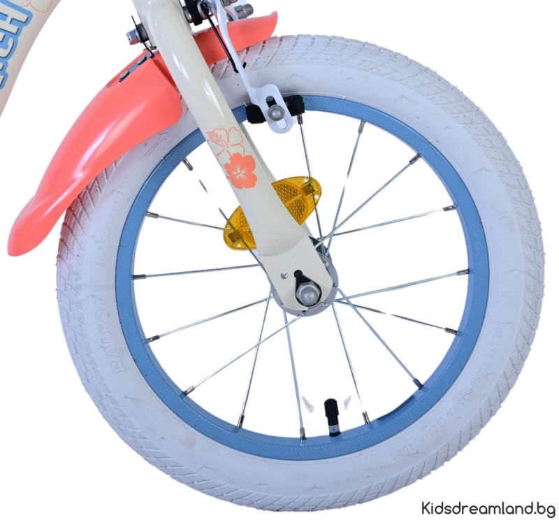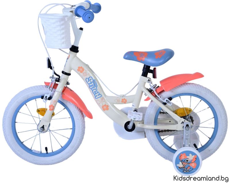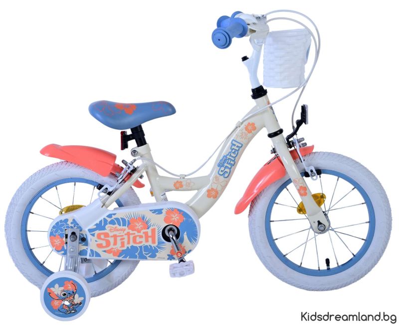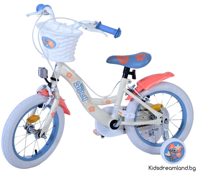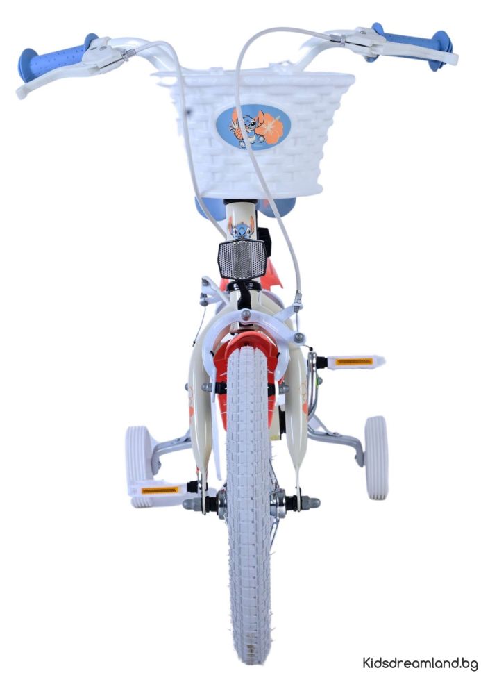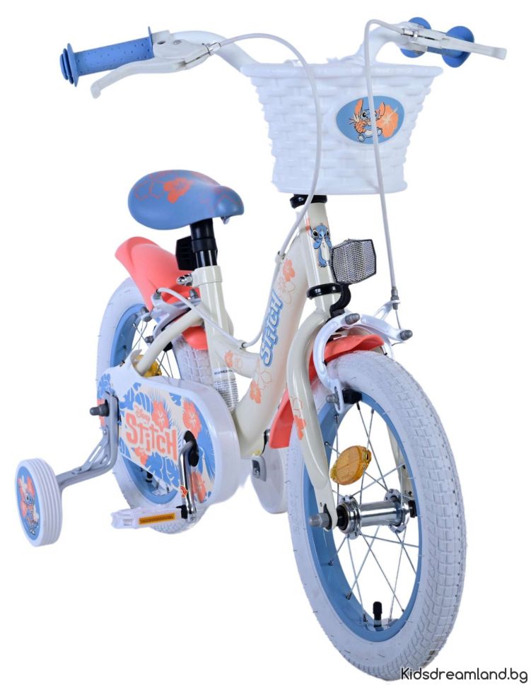 Безопасността е на първо място! Ето защо този готин велосипед има две ръчни спирачки и подвижни тренировъчни колела. Освен това велосипедът има рефлектори в колелата отпред и отзад на велосипеда. Помислено е и за комфорта. Красивият кремав цвят и тропически велосипед Stitch е оборудван с кош. За да се наслаждавате на велосипеда възможно най-дълго, седлото и кормилото са регулируеми по височина.