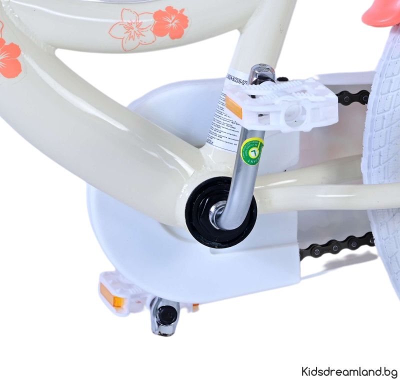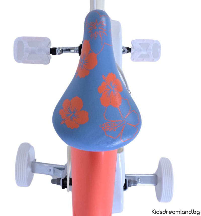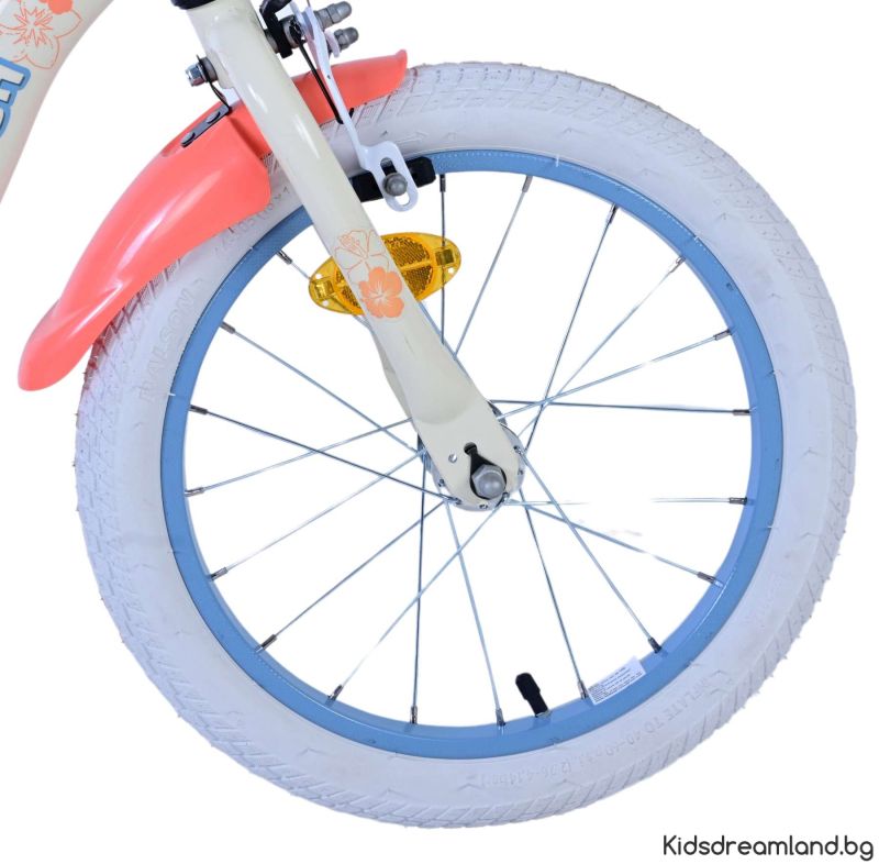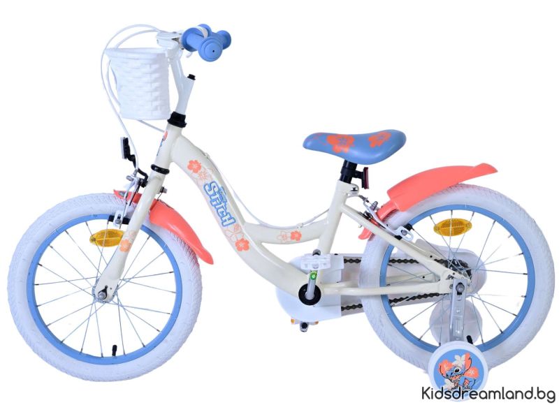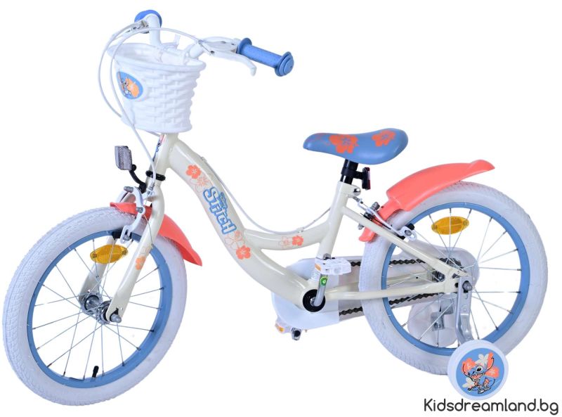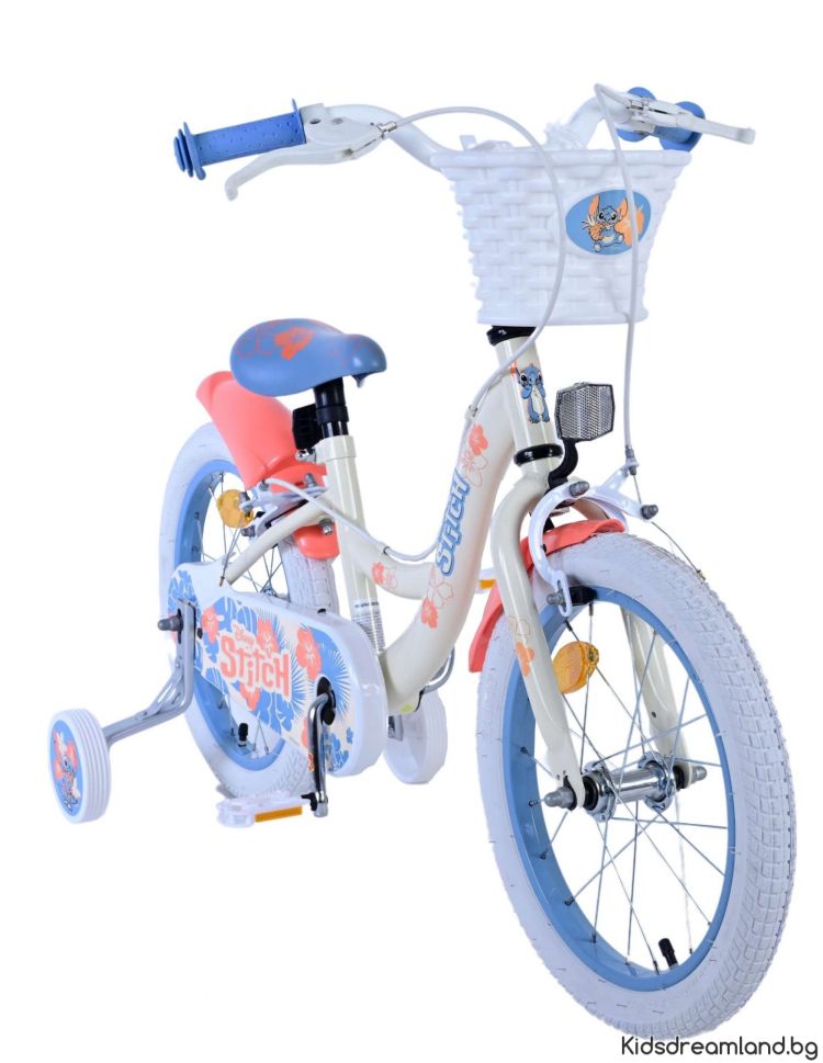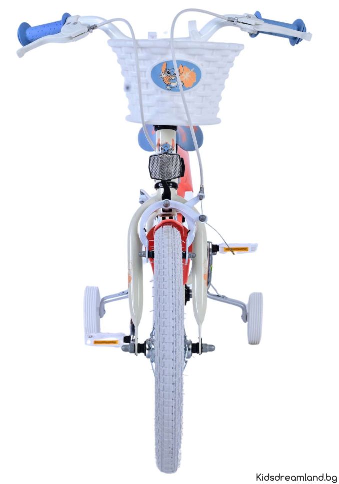 Безопасността е на първо място! Ето защо този готин велосипед има две ръчни спирачки и подвижни тренировъчни колела. Освен това велосипедът има светлоотразители в предните и задните колела. Помислено е и за комфорта. Красивият кремав цвят и тропически велосипед Stitch е оборудван с кош. За да се наслаждавате на велосипеда възможно най-дълго, седлото и кормилото са регулируеми по височина.