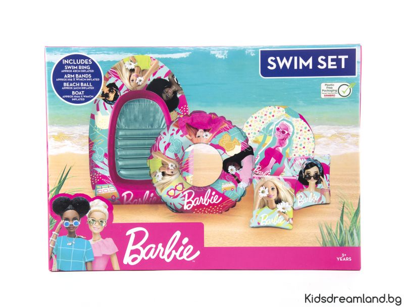 Комплектът включва: пояс за плуване с размер около 42 см, пояси за ръце 16 х 14 см, плажна топка 30 см, лодка 100 х 60 см. Посочените размери са приблизителни за играчките, в надуто състояние.