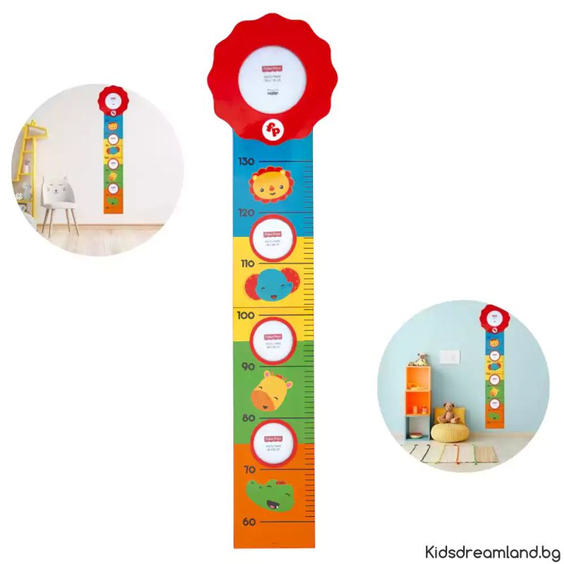 Следете височината на вашето дете с този весел метър на растежа от Fisher-Price. Метърът за стена е изработен от красиво дърво и е украсен с изображения на лъвче, слон, жираф и крокодил.