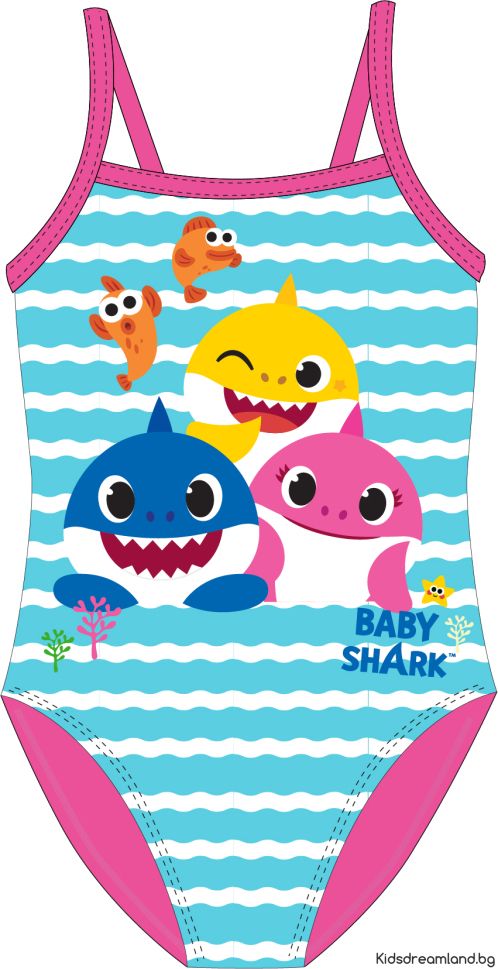 Сладък цял бански костюм с мотив на популярни герои от "Baby Shark". Облеклото има цветен морски фон с вълни и усмихнати акули, които му придават забавен характер. Розовите покрития подчертават момичешкия стил, а материята е гъвкава, което гарантира удобство и комфорт при игра във водата. Перфектен за почивка край морето или дни, прекарани край басейна.