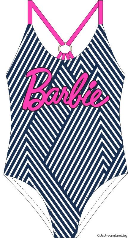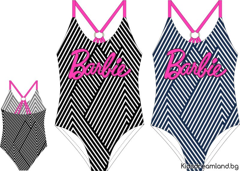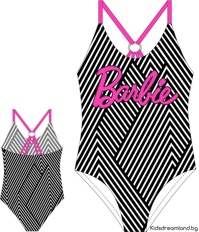 Стилен бански с изразителни геометрични шарки в черно-бели и тъмносиньо-бели нюанси. Отпред има емблематичното лого "Barbie" в ярко розово, което придава модерен акцент на цялото нещо. Благодарение на регулируемите презрамки и еластичната материя, облеклото е удобно и идеално за плаж или басейн. Предлага се в два цветови варианта, което ви позволява да изберете този, който най-добре отговаря на стила на потребителя.