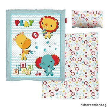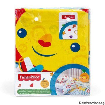 Размер: плик за завивка 110 х 130 см, втален чаршаф 100 х 140 см; калъфка за възглавница 25 х 45 см Описание За нула време ще попаднете в страната на сънищата под това памучно спално бельо със сладка животинска щампа от Fisher Price. Комплектът от 3 части се състои от чаршаф с размери 100 х 140 см, плик за завивка 110 х 130 см и калъфка за възглавница 25 х 40 см.