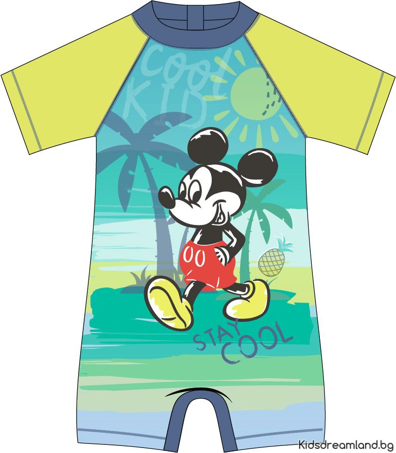Детски бански Mickey Mouse Очарователен бански костюм с къс ръкав с лика на емблематичния персонаж Мики Маус. Тропическият фонов мотив с палми, слънце и плаж и надписът „Stay Cool“ добавят празнична атмосфера. Цветовете в нюанси на зелено, жълто и синьо правят тоалета привлекателен и изпъкващ на плажа или край басейна. Изработена от гъвкав, бързосъхнещ материал, осигурява комфорт при игра във водата и защита от слънцето.