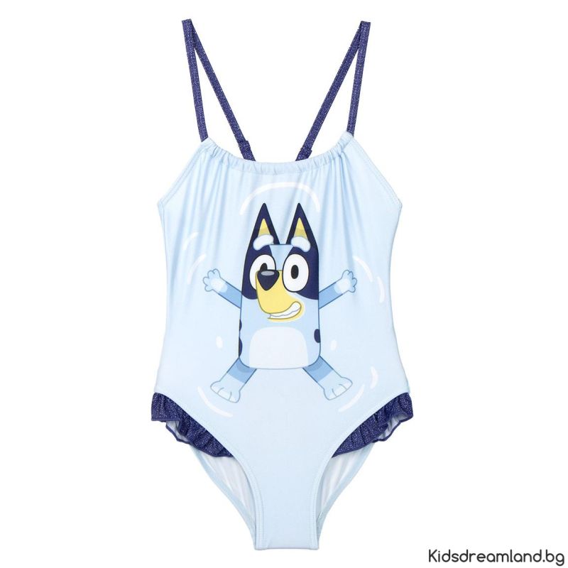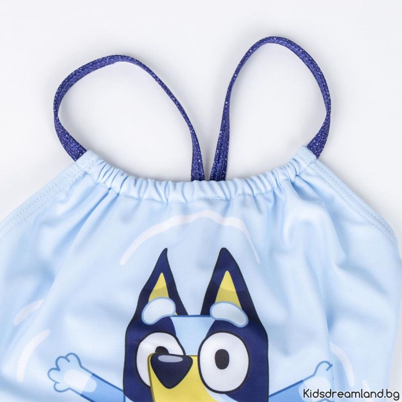 Удобното горнище и бански са декорирани с волани и щампа с любимите герои от анимационния сериал "Bluey"