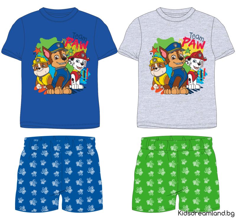 Цветна пижама за деца с техните любими герои от Paw Patrol: Chase, Rubble и Marshall. Комплектът се състои от тениска с къс ръкав и шорти. Тениската се предлага в синьо или сиво с ярък принт на екипа на Paw Patrol. Късите панталонки се предлагат в синьо или зелено, украсени със сладка шарка на лапи. Идеална лятна пижама, която със сигурност ще зарадва всеки малък фен на Paw Patrol.