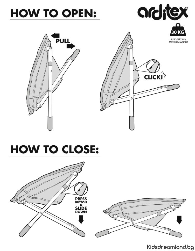 • За да отворите стола, хванете облегалката с една ръка и металната рамка с другата и ги раздалечете, докато двойният предпазен механизъм застане в заключено положение.