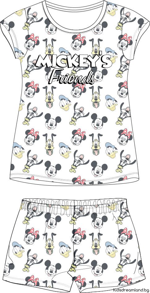 Забавна и цветна детска пижама с къс ръкав, декорирана с изображения на любими герои на Disney – Мики Маус, Мини Маус, Доналд Дък и Гуфи. Горнището на пижамата е с цяла щампа с изображения на тези герои и надпис „Приятелите на Мики“. Късите панталони също се отличават с щампи с повтарящи се символи, създавайки уникален ансамбъл, идеален за по-топли нощи.