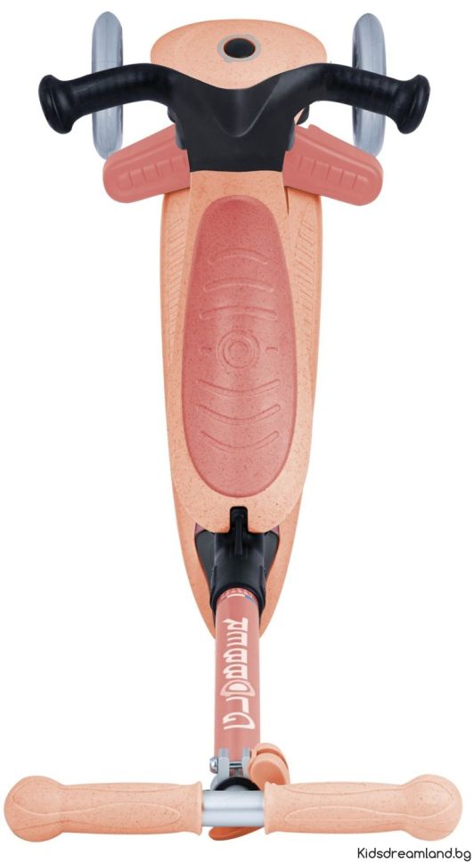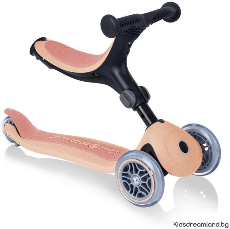 Изработена от 100% рециклирана пластмаса и пшенична слама, тази тротинетка отговаря на Глобалния стандарт за рециклиране (GRS). Екологичният подход не прави компромис с качеството – стабилната конструкция, удобната седалка и висококачествените колела осигуряват безопасност и комфорт във всяка възрастова фаза.