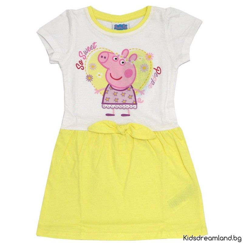 Очарователна жълта рокля без ръкави с весела щампа на прасенцето Пепа – любимата героиня на малките деца. Изработена от 100% мек и дишащ памук, идеална за горещите летни дни. Перфектна за игра, разходки и детски партита. Нека усмивката на Пепа озари деня на вашето дете!
