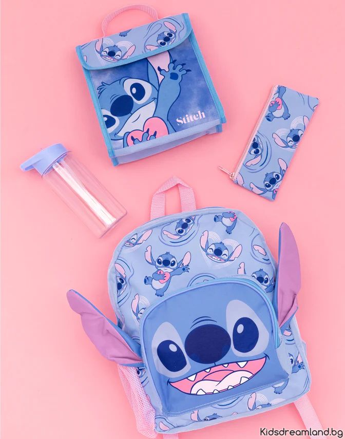 Официално лицензиран и ексклузивен, този комплект включва синя раница, чанта за обяд, бутилка за вода и пенал, всички украсени със забавни и игриви дизайни на любимия ни палав извънземен от обичания анимационен филм. Вашето дете ще обича да носи всичките си училищни принадлежности с любимия си герой на Disney до себе си! Детайли за продукта Комплектът включва Раница - с основно отделение с цип, мрежест държач за бутилка, преден джоб с цип, регулируеми презрамки Размери приблизително 36x26x10 см Чанта за обяд - изолирана с дръжка за носене Размери 21x20x9,5 см Несесер за моливи размери 20x8 см Бутилка за вода 500 мл Без BPA Материали - Чантата, чантата за обяд и несесерът за моливи са изработени от 100% полиестер