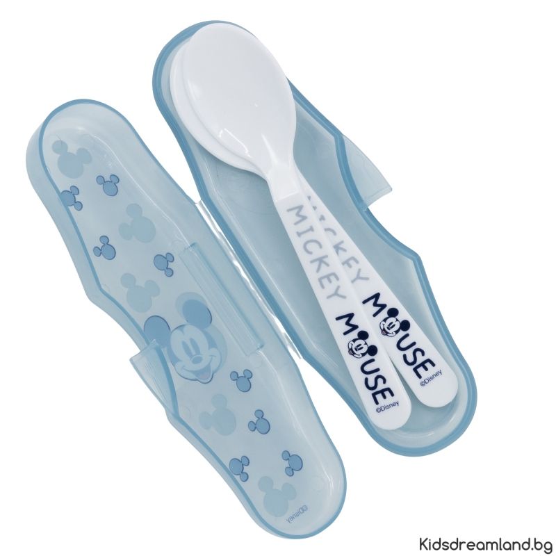 Практичен комплект от две детски лъжички с Мики Маус в удобен калъф – идеален за разходки, пътувания и ежедневна употреба.